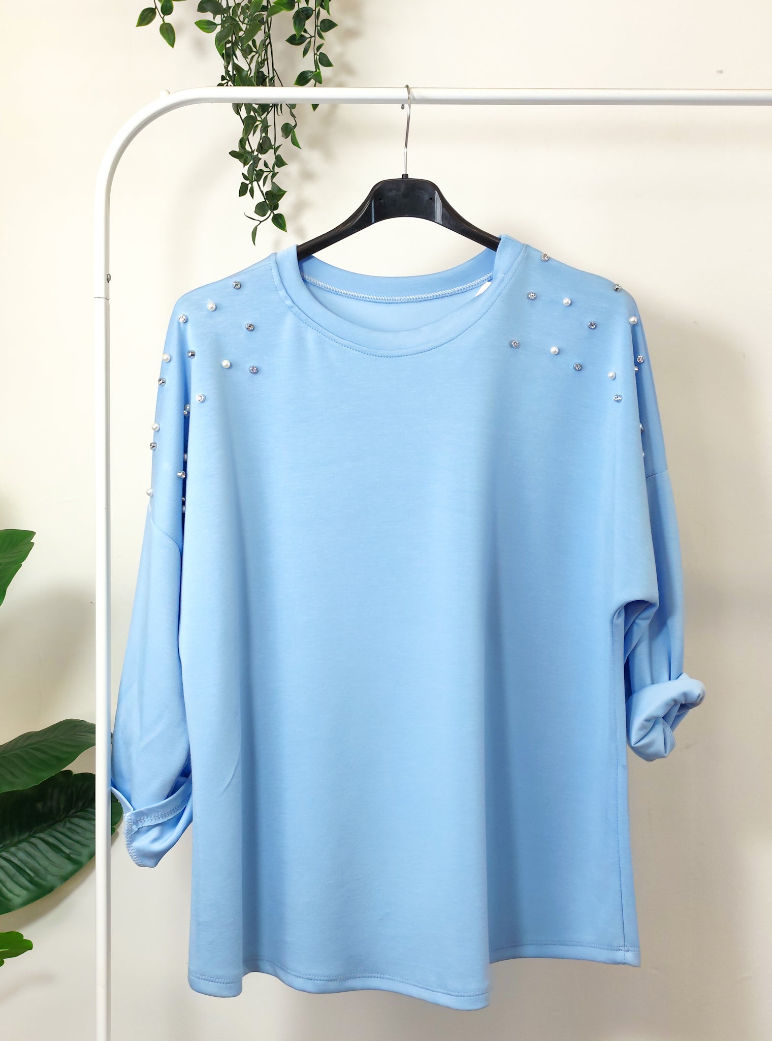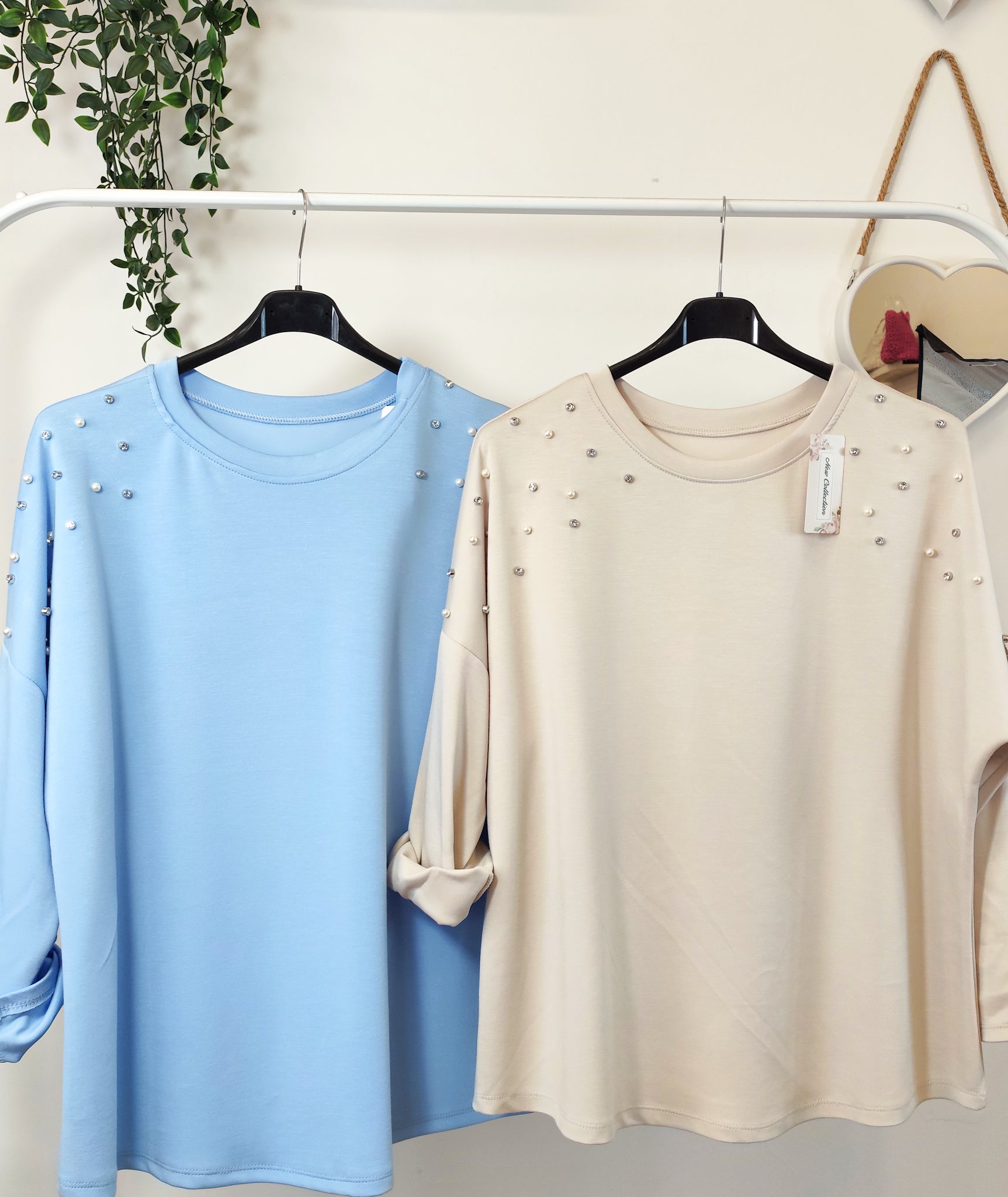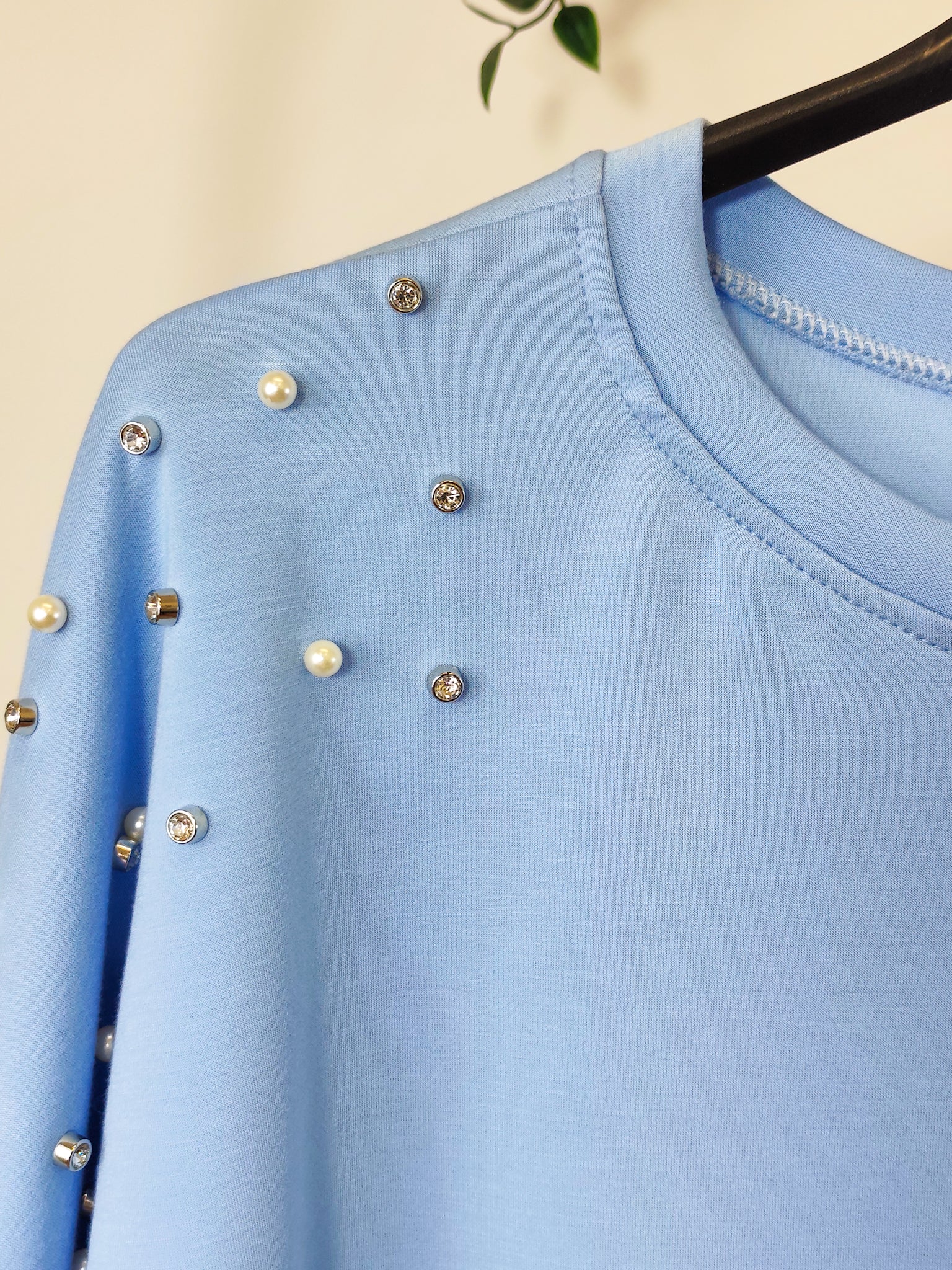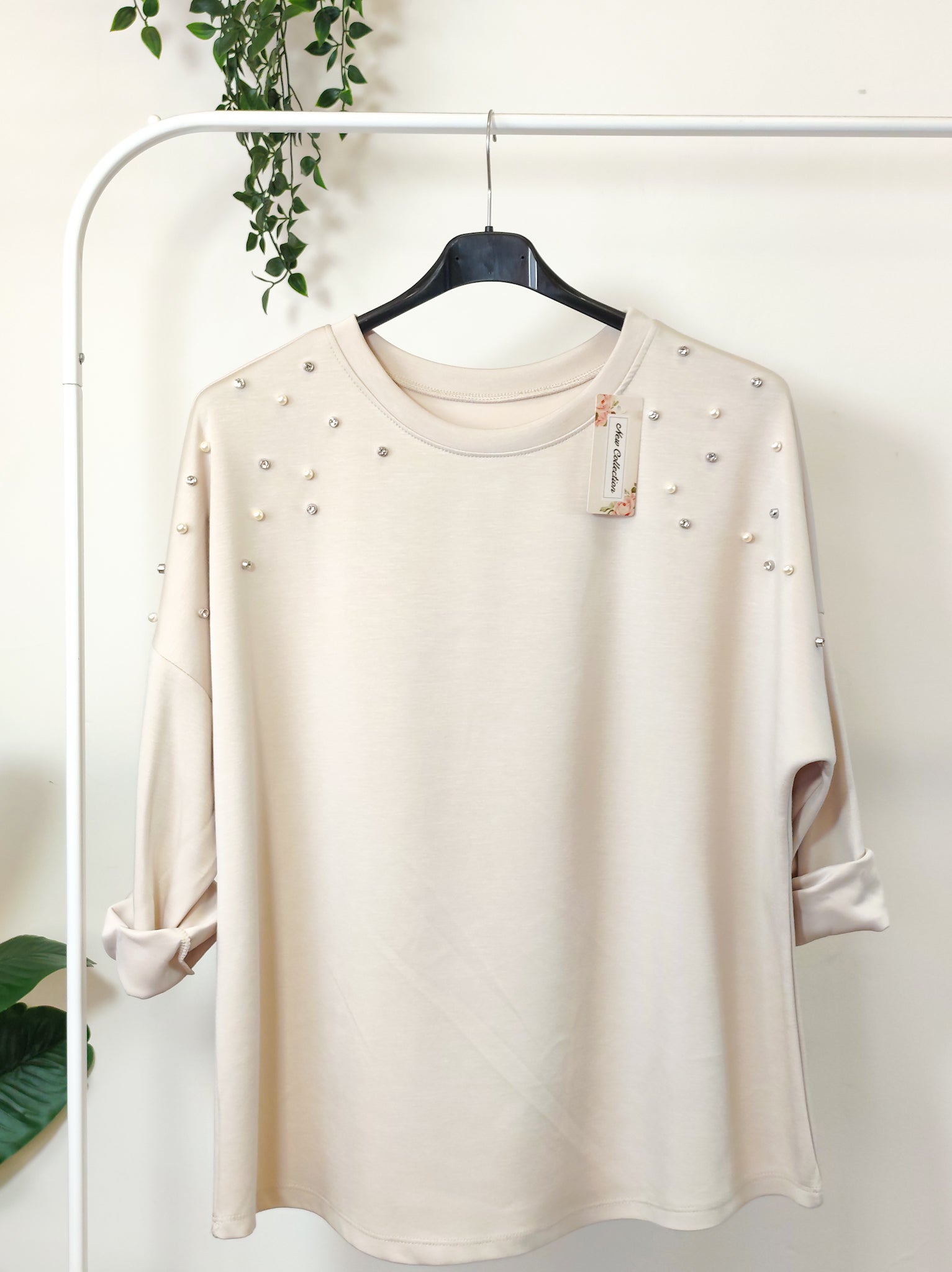 Un taglio semplice per questa bellissima felpetta in neoprene arricchita da punti luce di perle e strass.