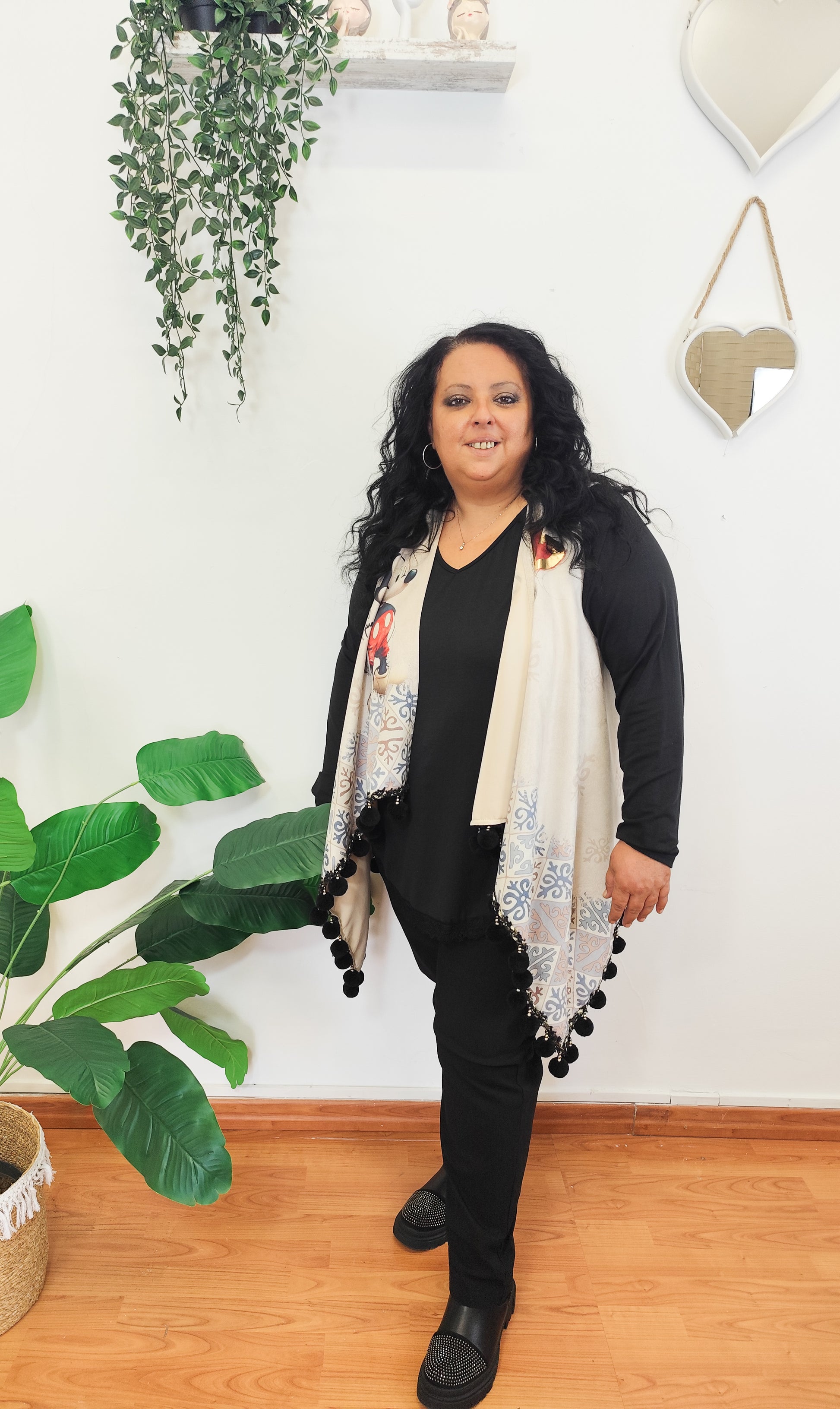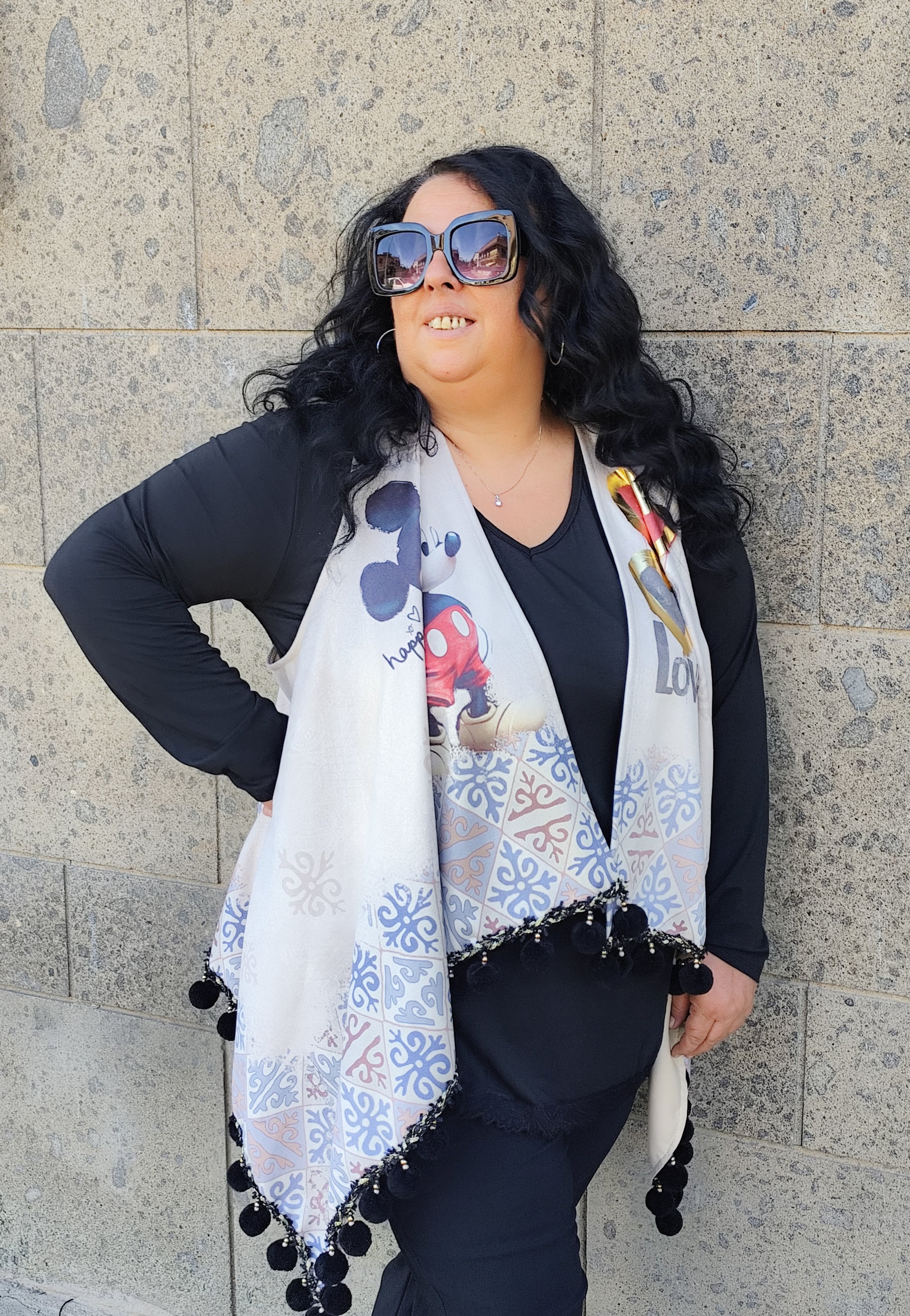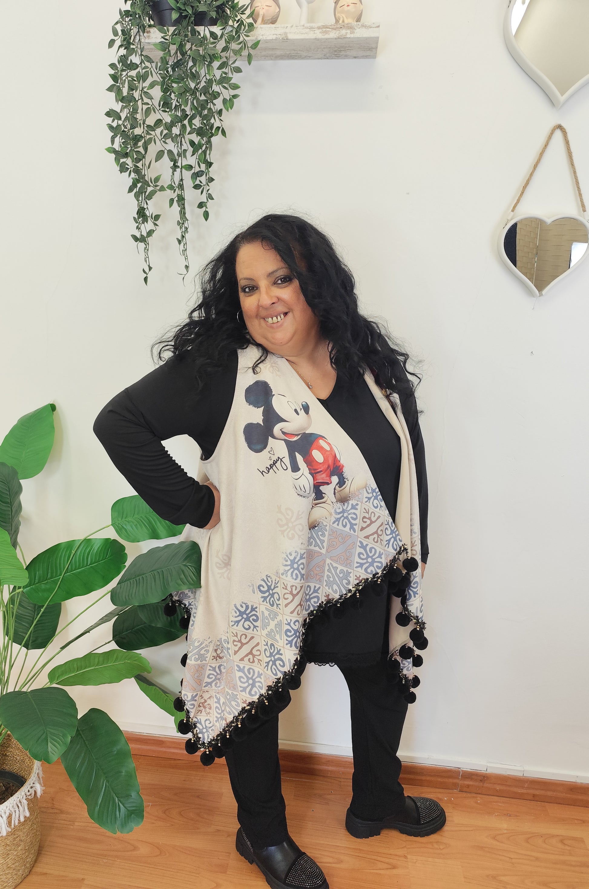 Un gilet originale e divertente, con stampa Disney e dettagli fantasia che richiamano le maioliche mediterranee. Il bordo è arricchito da pon pon per un tocco sbarazzino e unico. Morbido, leggero e facile da abbinare, è il capo perfetto per dare personalità ai tuoi look quotidiani.