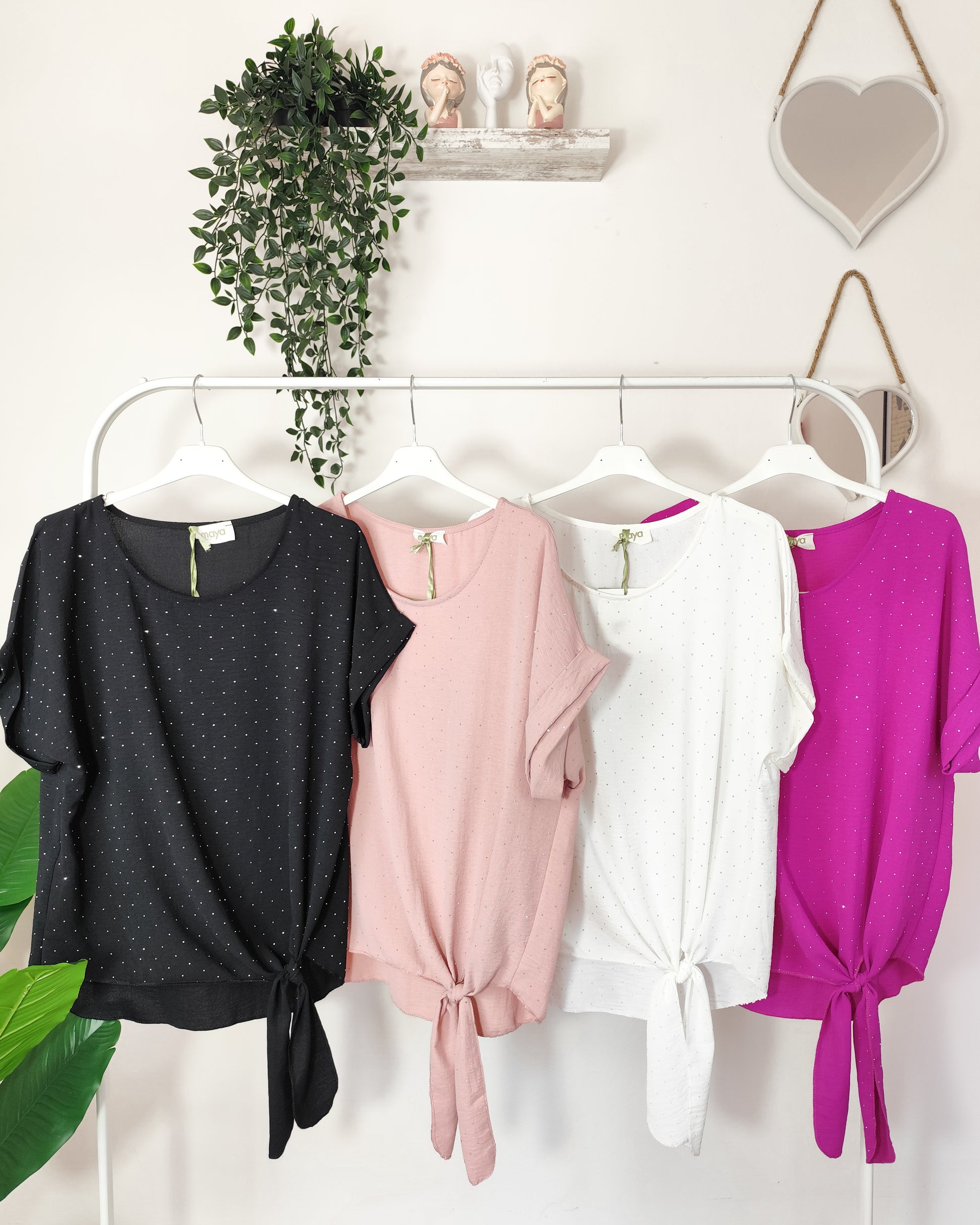 Maglia con nodo frontale e micro strass: semplice, brillante e strategica!