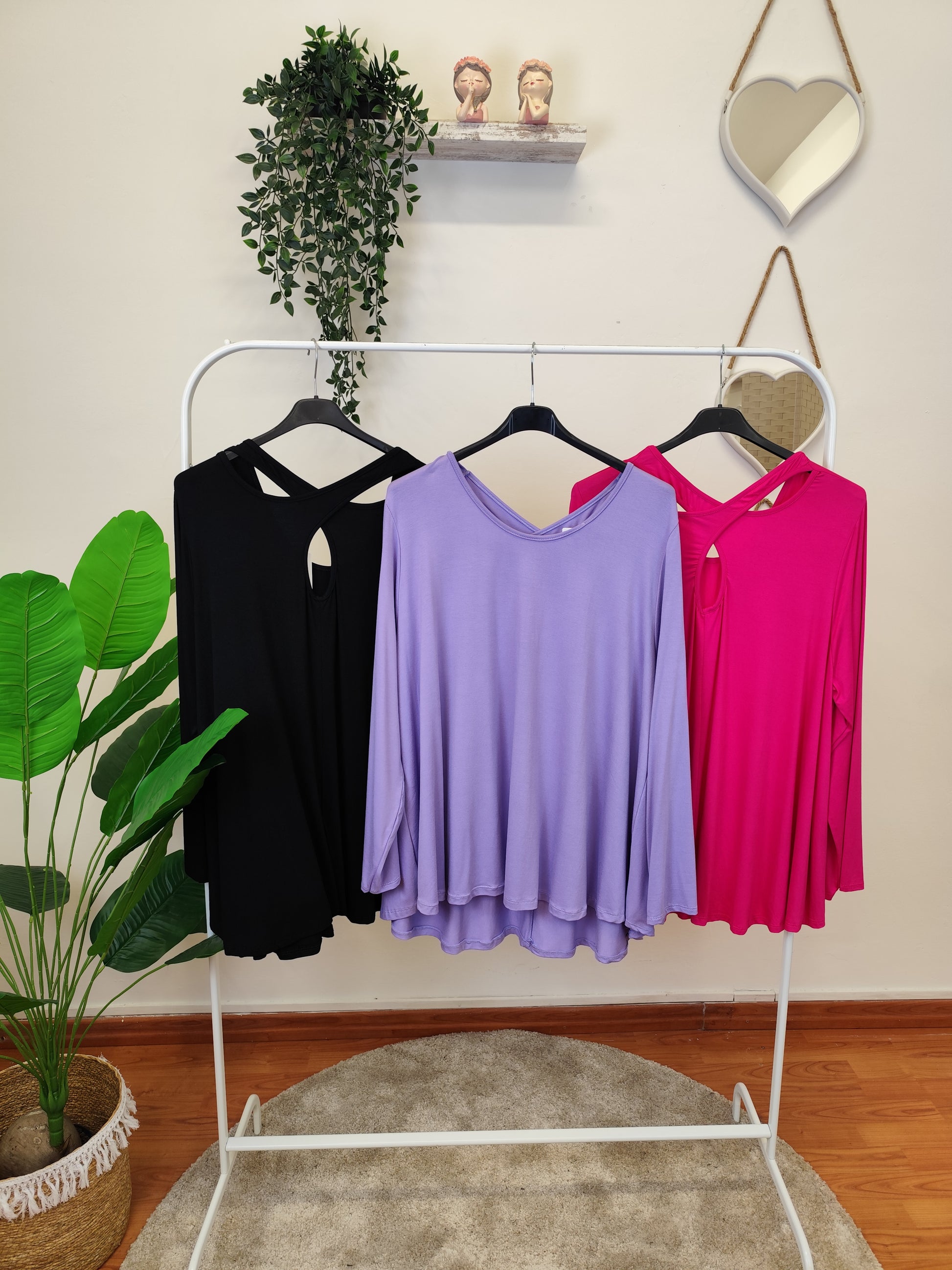 Morbida, fluida e con un dettaglio cut-out sulla schiena che la rende unica. Perfetta su jeans o pantaloni eleganti. Disponibile in nero, lilla e fucsia.