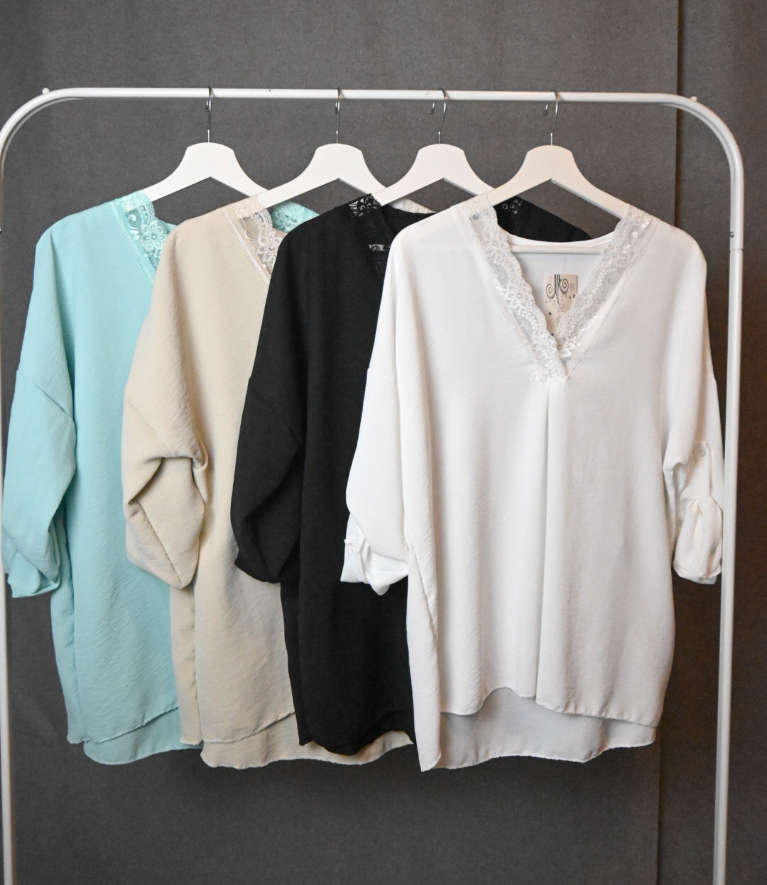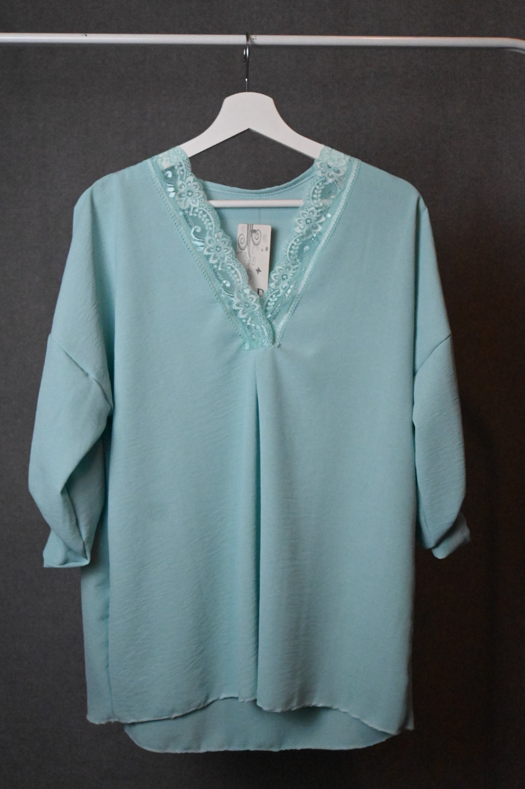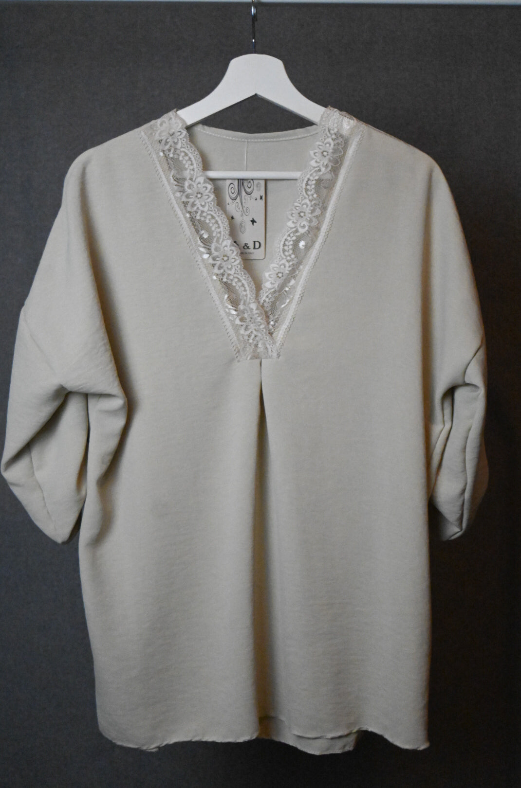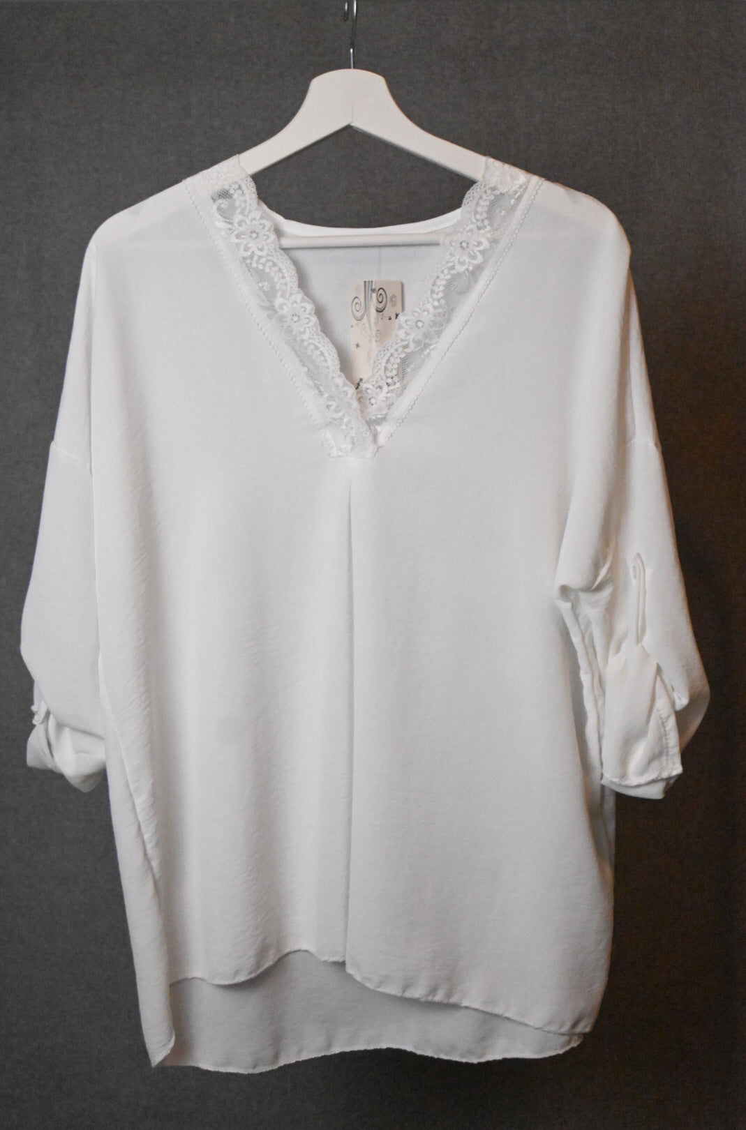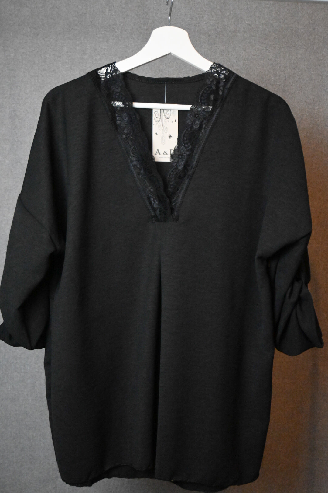 Maglia taglio classico con manica lunga, scollo a V con profilo di pizzo