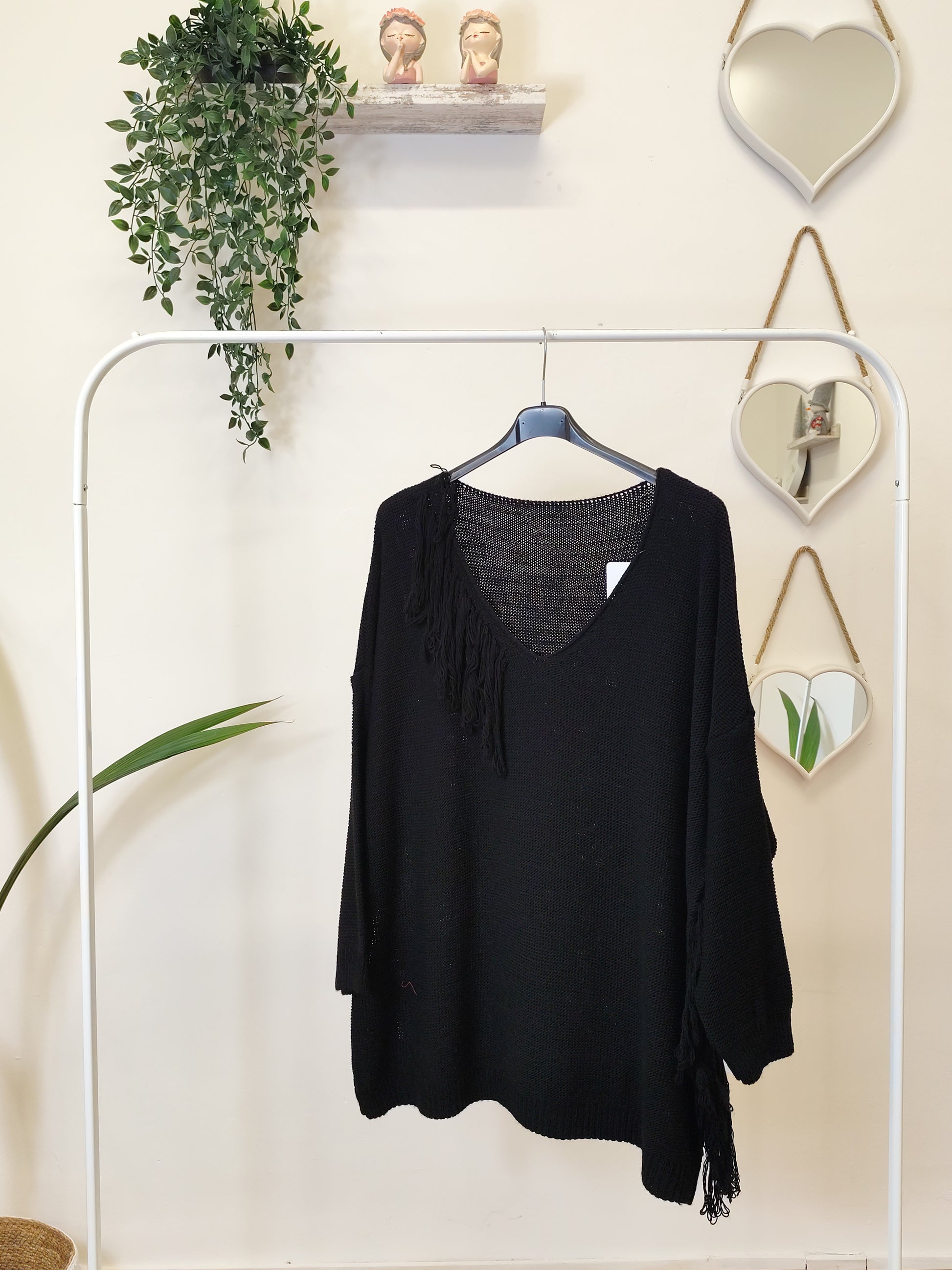 "Maglione oversize in morbido filato leggero, perfetto per un look casual e versatile. Caratterizzato da un elegante scollo a V e dettagli decorativi con frange che aggiungono un tocco di originalità. Disponibile in vari colori, questo capo veste comodamente dalla taglia 50 alla 56, valorizzando ogni silhouette. Ideale per le giornate più fresche, si abbina facilmente a jeans o leggings per un outfit comodo e chic."