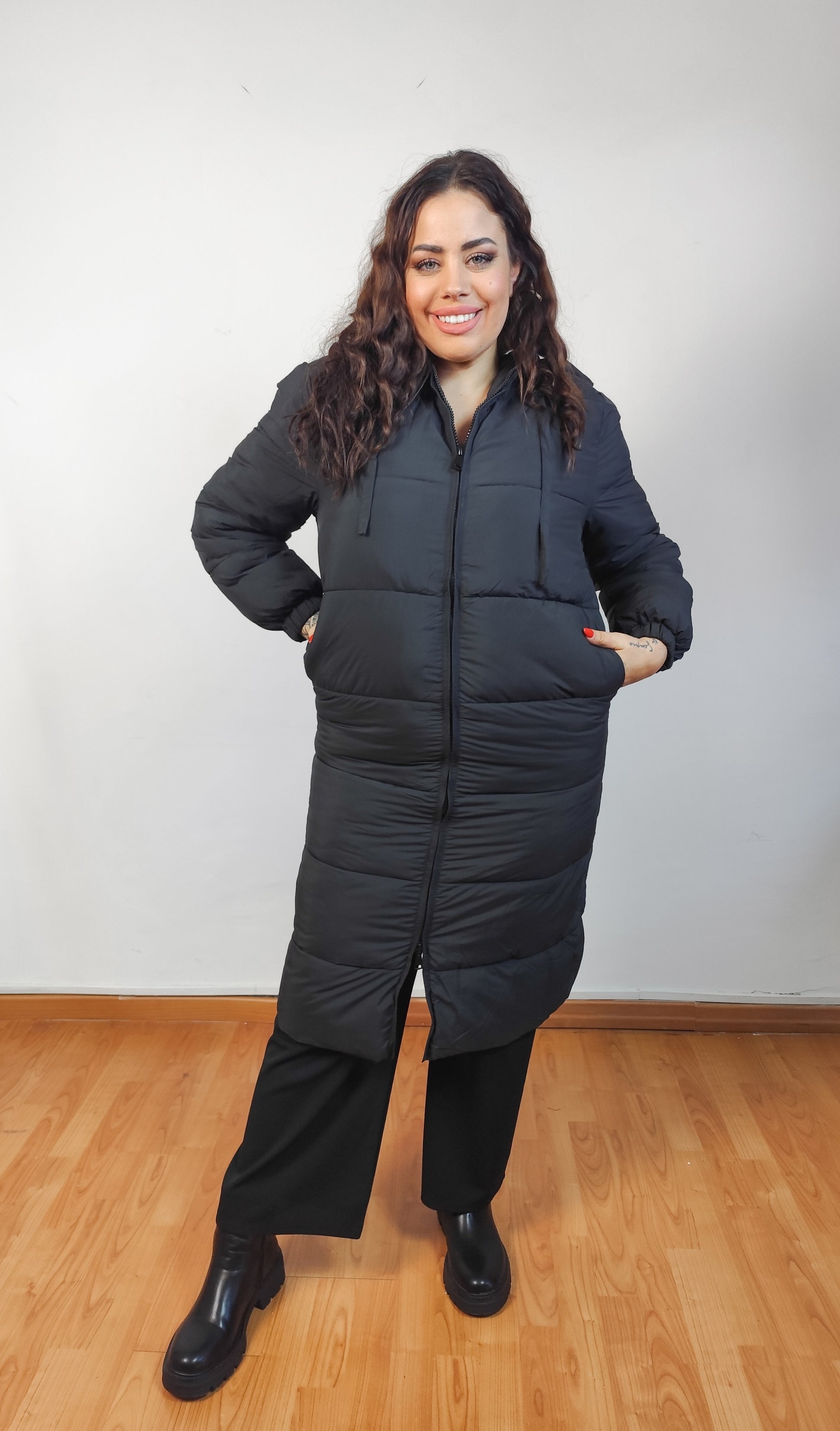 La linea è pulita e allungata, studiata per valorizzare le forme curvy senza appesantire. L’imbottitura è calda ma leggera, perfetta per affrontare le giornate fredde con comfort e libertà di movimento.