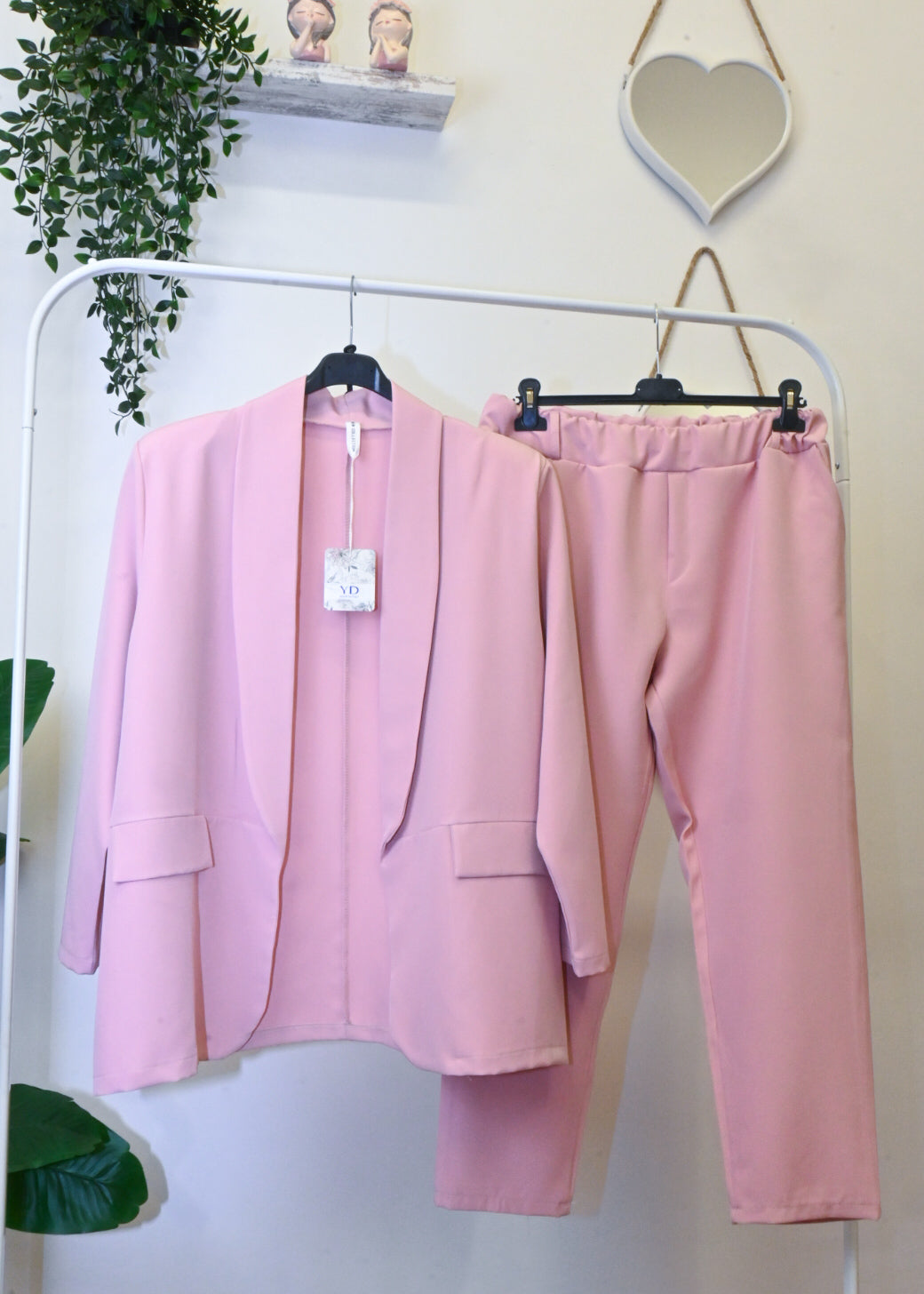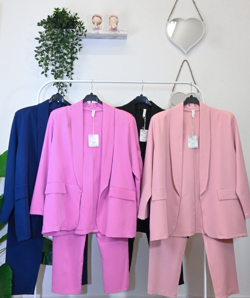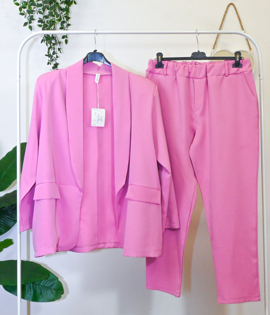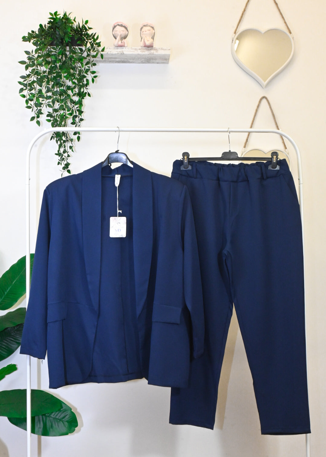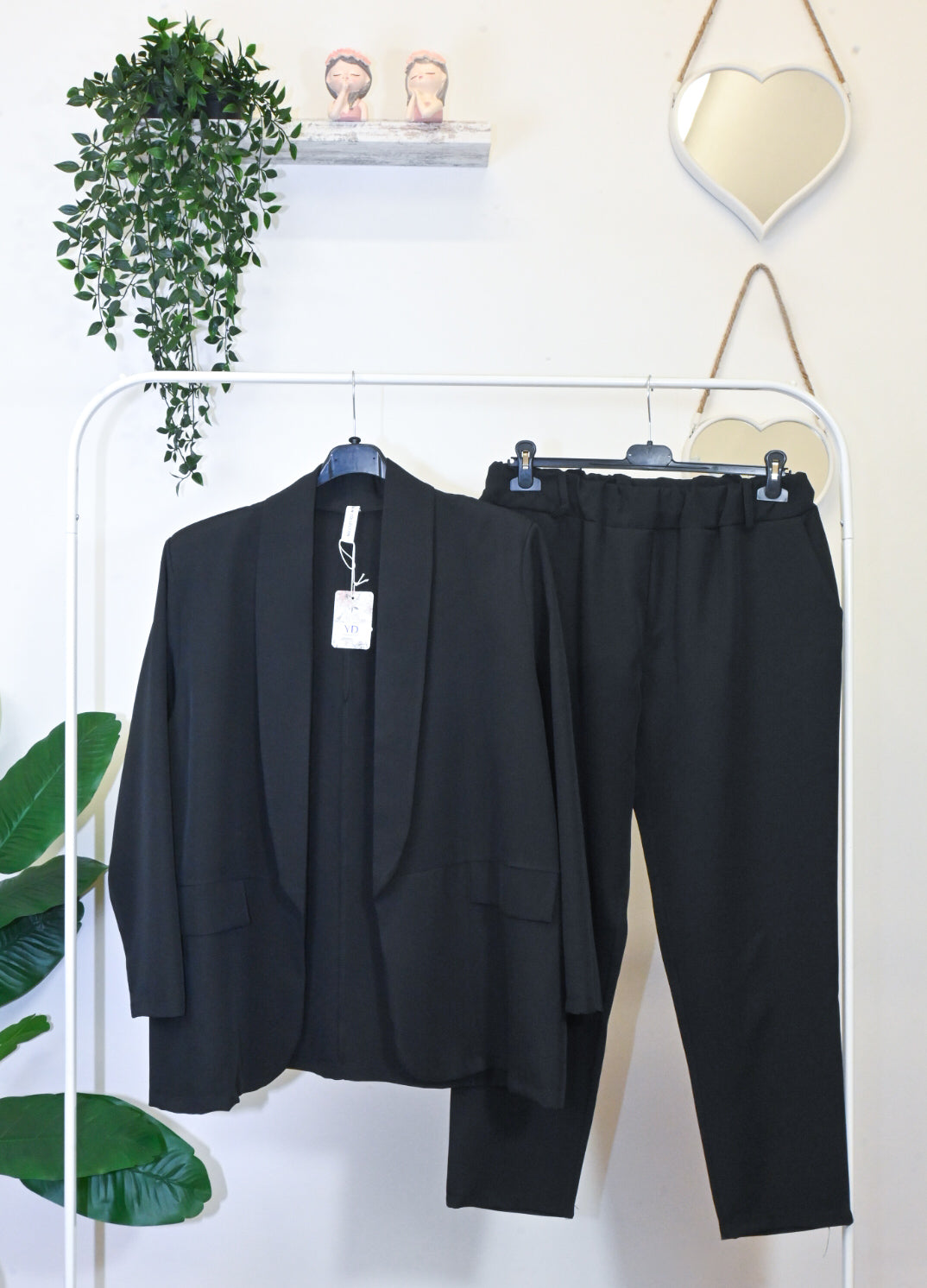 Un completo raffinato e versatile, perfetto per ogni occasione! Questo tailleur curvy è realizzato in tessuto leggero e fluido, con una vestibilità che esalta le forme senza costringere. La giacca dal taglio morbido e i pantaloni a palazzo con tasche creano un look sofisticato e adatto sia a eventi eleganti che a giornate in ufficio.