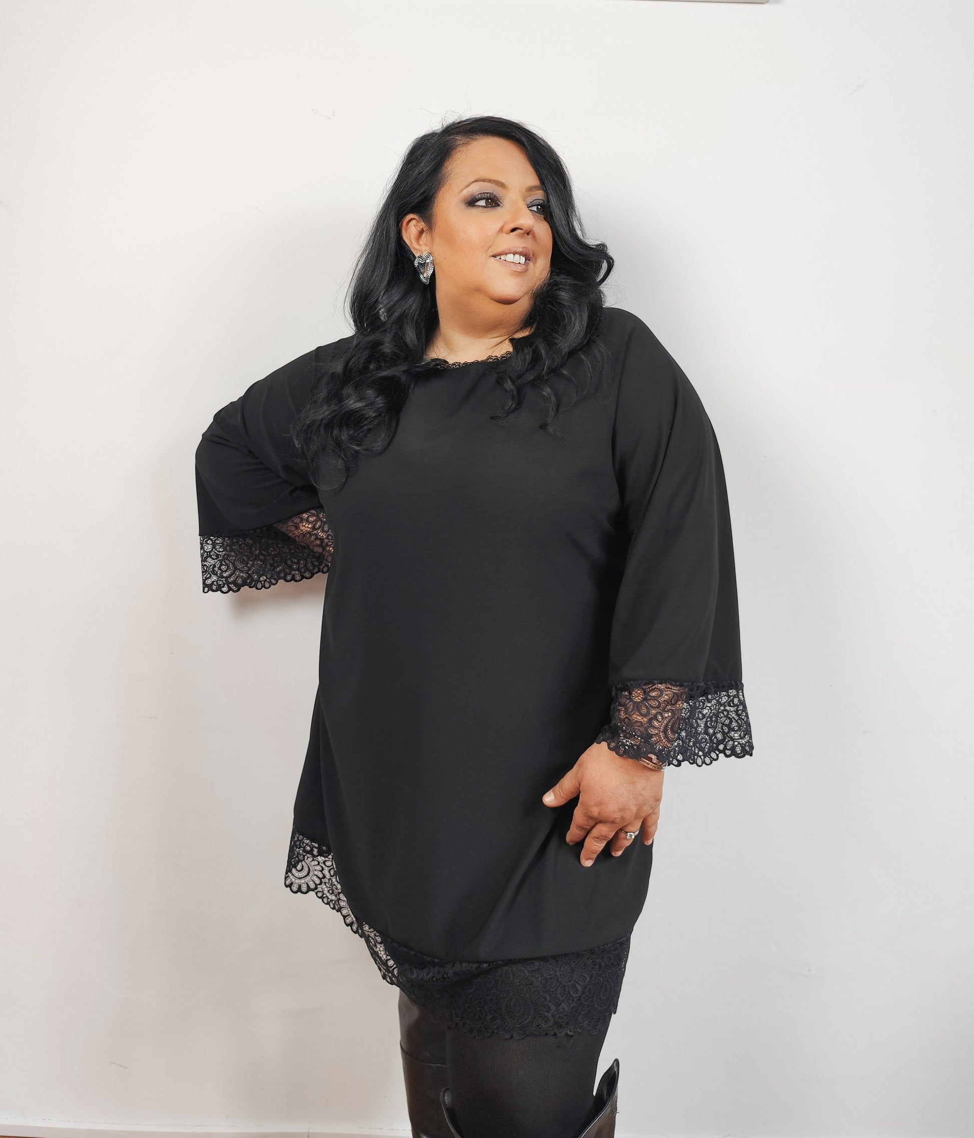 La linea morbida scivola sul corpo donando armonia, mentre i ricami in pizzo sulle maniche e sull’orlo aggiungono un tocco raffinato che non passa inosservato.