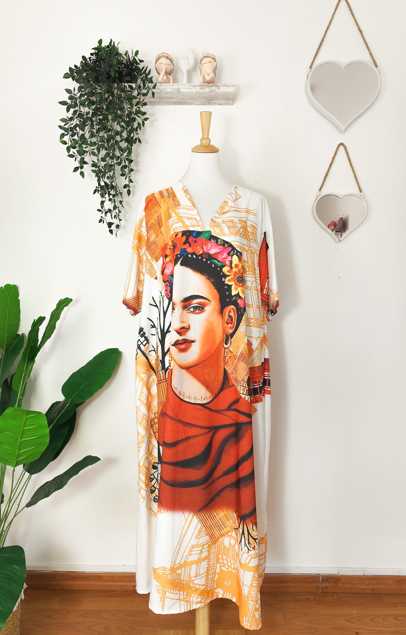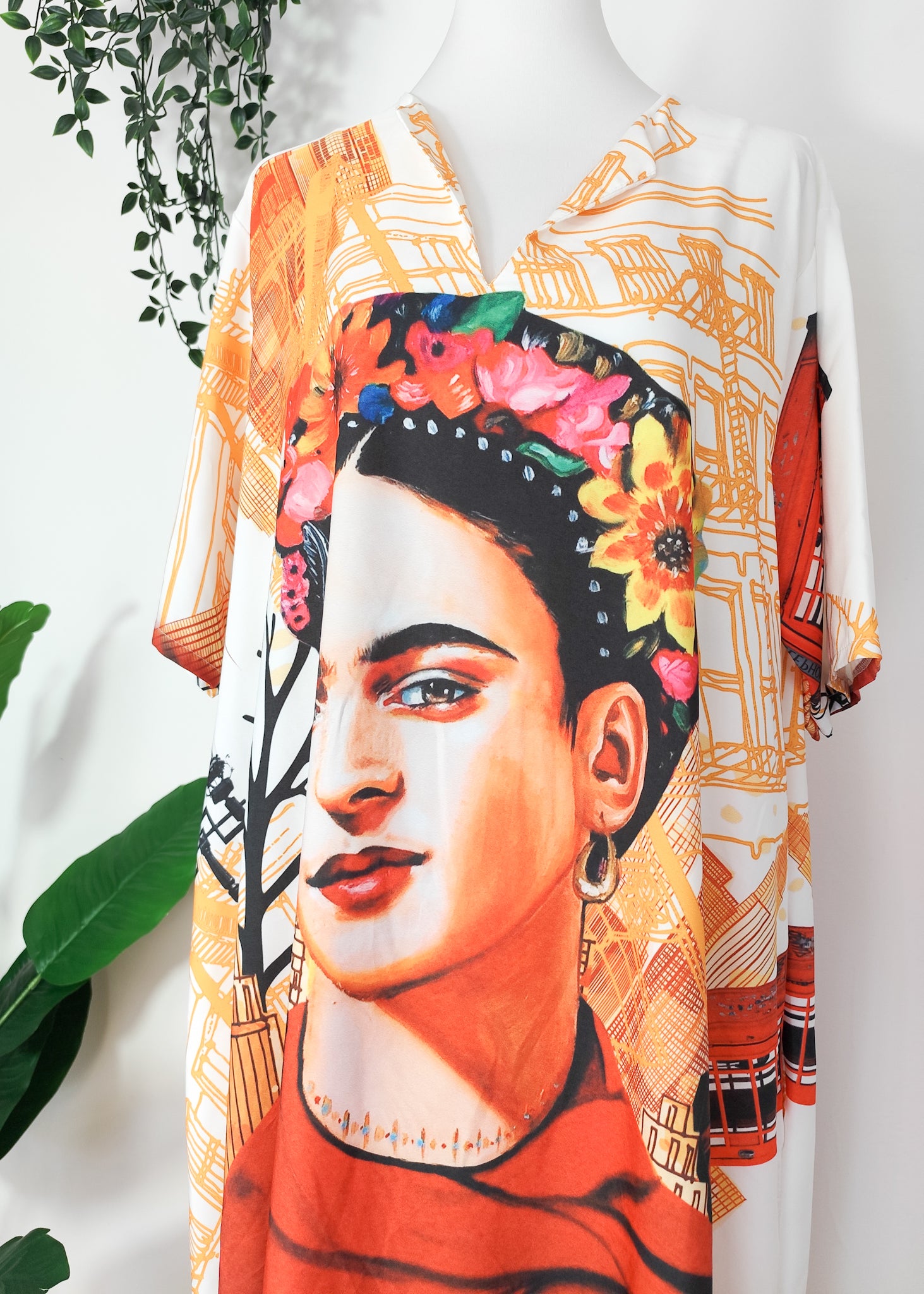 Abito lungo stampa Frida kahlo taglio dritto, girocollo con manica corta e tasche