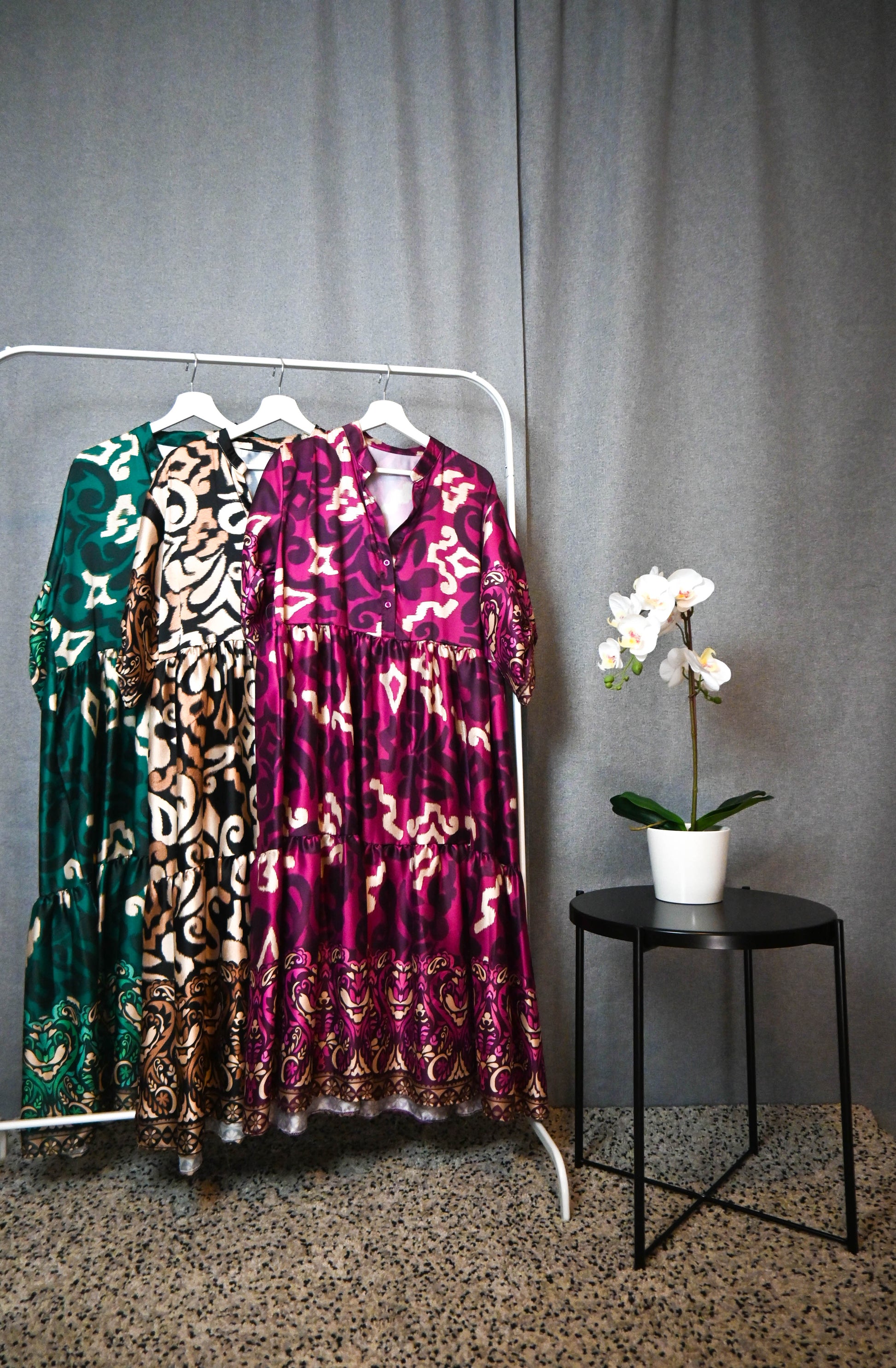 Vestito con colletto alla coreana in raso , manica a tre quarti con bottoncino.