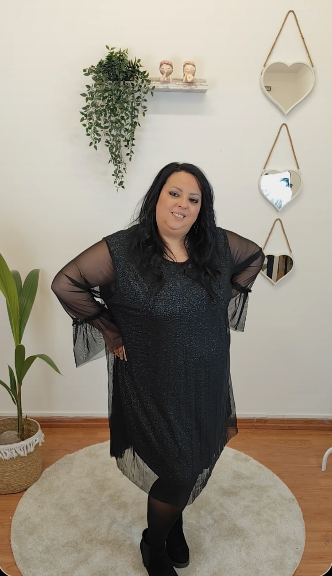 "Questo abito in tulle plissettato rivestito in lurex è un mix perfetto di eleganza e luminosità, ideale per chi desidera distinguersi con stile. Le maniche lunghe trasparenti aggiungono un tocco di sofisticata leggerezza, mentre la vestibilità morbida è pensata per adattarsi comodamente alle taglie dalla 50 alla 60. Con una circonferenza seno di 156 cm, fianchi di 160 cm e una lunghezza di 105 cm, è perfetto per valorizzare ogni silhouette con grazia e modernità."